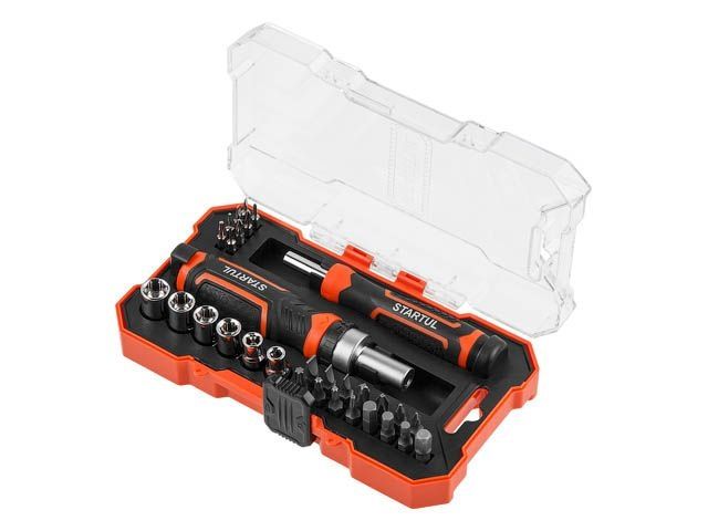Главная » Ручной инструмент » Слесарно-столярный инструмент » Наборы отверток » Отвертка реверс. с набором головок и бит 31пр. STARTUL PROFI (ST3095-31)