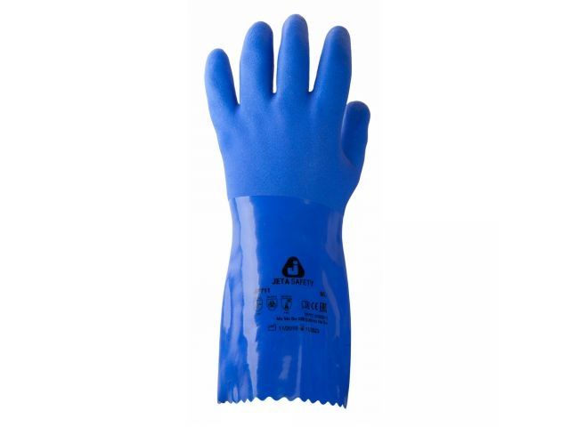 Перчатки хлопчатобумажные трикотажные с покрытием из ПВХ EN374: AJKL. EN388: 4121X. Толщина: 1,6 мм. Длина: 300 мм. Защитные свойства: Ми Мп Вн К80 Щ50 Перчатки, предназначенные для работ, при которых важна высокая химическая устойчивость и механическая защита. Перчатки изготовлены из высокопрочного ПВХ, внутренний слой выполнен из хлопка. Текстурное покрытие обеспечивает надежный захват. Хлопковая основа обеспечивает высокий комфорт. Высокая стойкость к кислотам (80%) и щелочам (50%), солям, спиртам, растворителям. Индивидуальная упаковка. Цвет: синий.