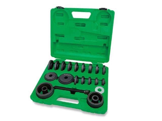 Универсальный набор для снятия и установки передних подшипников ступицы. С помощью данного набора возможна замена передних подшипников ступицы без необходимости демонтажа поворотного кулака и стойки в сборе.