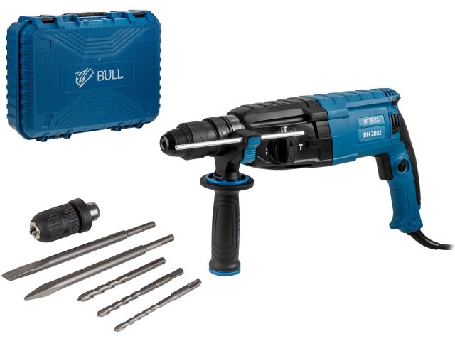 Главная » Электроинструменты » Обработка бетона » Перфораторы » Перфоратор BULL BH 2802 в чем. 850 Вт, 3.2 Дж, 28 мм, 4 реж. + 2 зубила, 3 сверла, БЗП в комплекте (вес 3.8 кг)