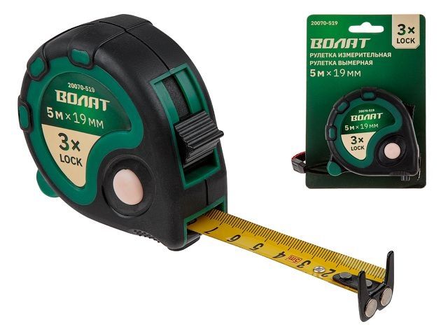 Главная » Измерительный инструмент » Рулетки, мерные ленты » Рулетка 5м/19мм обрезин. корп. ВОЛАТ (3 мех. фиксации, ABS+TPR, 2-х стор. шкала нанесения, 2-х стор. магнитный зацеп)