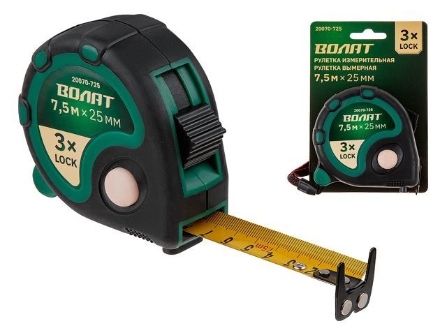 Главная » Измерительный инструмент » Рулетки, мерные ленты » Рулетка 7,5м/25мм обрезин. корп. ВОЛАТ (3 мех. фиксации, ABS+TPR, 2-х стор. шкала нанесения, 2-х стор. магнитный зацеп)