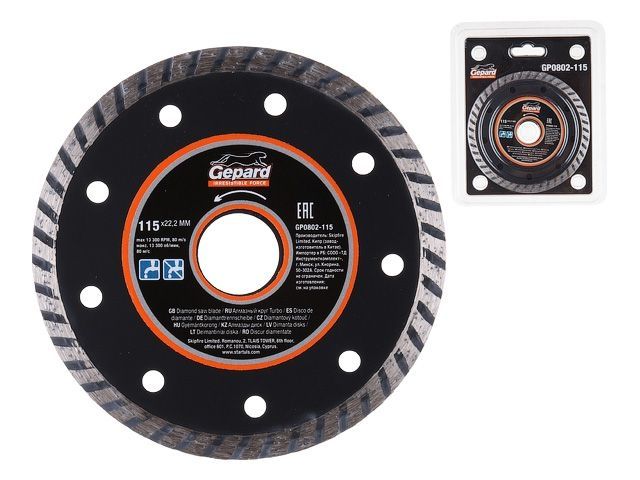 Главная » Оснастка к электроинструменту » Алмазная резка, шлифование и сверление » Алмазные круги Ф110,115мм » Алмазный круг 115х22 мм универс. Turbo GEPARD (сухая и мокрая резка)
