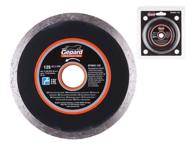 Главная » Оснастка к электроинструменту » Алмазная резка, шлифование и сверление » Алмазные круги Ф125мм » Алмазный круг 125х22 мм по керамике сплошн. GEPARD (мокрая резка)