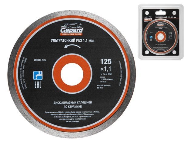 Главная » Оснастка к электроинструменту » Алмазная резка, шлифование и сверление » Алмазные круги Ф125мм » Алмазный круг 125х22 мм по керамике сплошн.ультратонкий GEPARD (сухая и мокрая резка, тонкий рез 1.1мм)