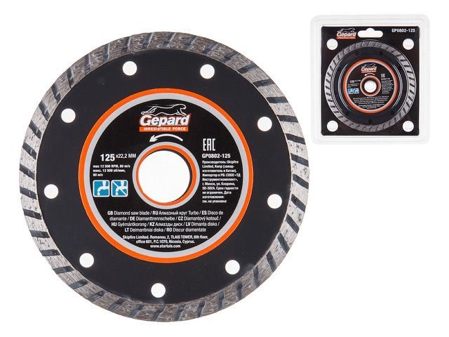 Главная » Оснастка к электроинструменту » Алмазная резка, шлифование и сверление » Алмазные круги Ф125мм » Алмазный круг 125х22 мм универс. Turbo GEPARD (сухая и мокрая резка)