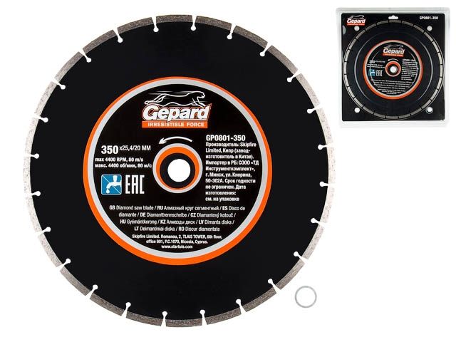 Главная » Оснастка к электроинструменту » Алмазная резка, шлифование и сверление » Алмазные круги Ф 350мм » Алмазный круг 350х20/25.4 мм по бетону сегмент. GEPARD (сухая и мокрая резка)