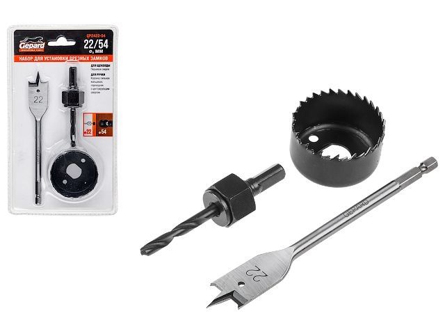 Комплект: сверло перьевое с диаметром 22мм (для щеколды) - 1шт., коронка пильная кольцевая по дереву с диаметром 54мм (для ручки) - 1шт., переходник с центрирующим сверлом - 1шт.;