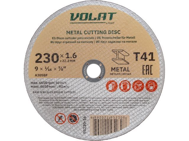 Главная » Оснастка к электроинструменту » Оснастка для угловых шлифмашин » Круги отрезные и обдирочные ф 230 мм » Круг отрезной 230х1.6x22.2 мм для металла ВОЛАТ LIGHT