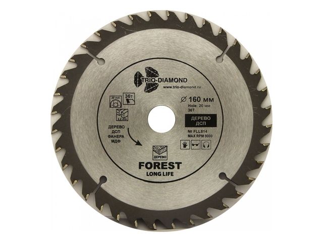 Диск пильный 160х20 мм 36 зубьев TRIO-DIAMOND Forest Long Life (FLL814) предназначен для распила древесины, ДСП, фанеры. Угол заточки 15 градусов. Максимальное число оборотов 9000 RPM. Тип диск пильный Диаметр 160 мм Количество зубьев 36 шт Ширина пропила (зуба) 2,2 мм Форма зуба ATB Максимальное число оборотов 9000 об/мин Угол наклона зубьев положительный Передний угол 15 ° Совместимость пила циркулярная, пила дисковая
