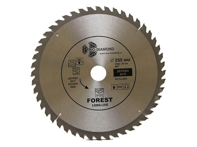 Диск пильный 255х30 мм 48 зубьев TRIO-DIAMOND Forest Long Life (FLL832) предназначен для распила древесины, ДСП, фанеры. Угол заточки 15 градусов. Максимальное число оборотов 5800 RPM. Тип диск пильный Диаметр 255 мм Количество зубьев 48 шт Ширина пропила (зуба) 2,8 мм Форма зуба ATB Максимальное число оборотов 5800 об/мин Угол наклона зубьев положительный Передний угол 15 ° Совместимость пила циркулярная, пила дисковая, пила торцовочная