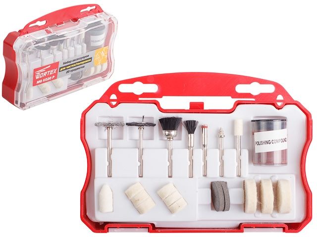 Главная » Оснастка к электроинструменту » Принадлежности для электроинструмента » Оснастка для граверов » Набор аксессуаров для гравера 20 предметов в боксе (для чистки/полировки) (WORTEX)