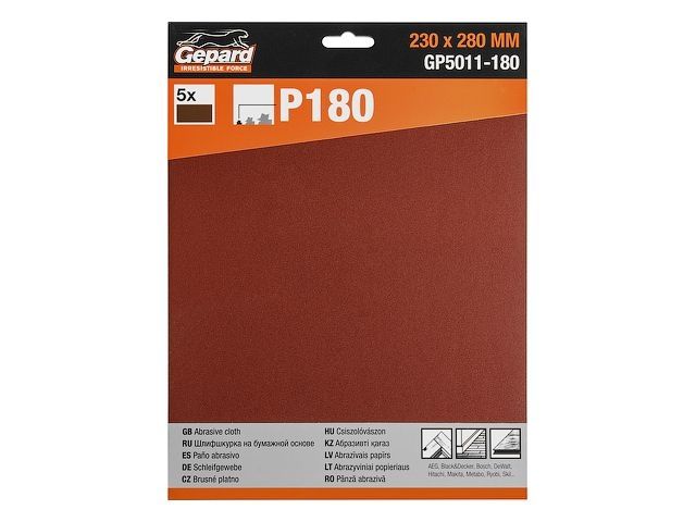 Главная » Оснастка к электроинструменту » Шлифование и полирование » Шлифшкурка в листах » Шлифлист 230х280мм Р180 бум.осн. 5шт. GEPARD (GP5011-180) (бумага наждачная абразивная, лист шлифовальный абразивный, шлифшкурка)
