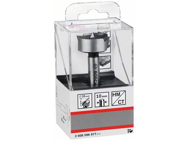 Сверло Форстнера Bosch предназначено для дрелей, имеющих сверлильный патрон 10 мм. Оно изготовлено из улучшенной стали по собственному заводскому стандарту. Это точное сверло, которое оснащено двумя главными и боковыми режущими кромками, твердость которых мин. 50 HRC. Центрирующее сверло короткое. Кованная и шлифованная сверлильная головка белого цвета с черными пазами. Данная оснастка идеально подходит для работы как по твердой, так и по мягкой древесине, фанере. Рез получается качественный, а кромка отверстия - без скола.