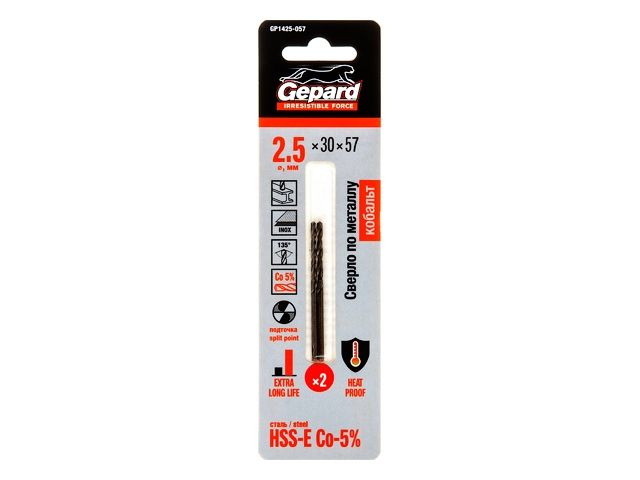 Главная » Оснастка к электроинструменту » Сверление » Сверла по металлу цилиндрический и шестигранный хвостовик GEPARD » Сверло по металлу ц/х 2.5х30х57 мм HSS-Co, комплект из 2-х шт GEPARD (кобальт 5%)