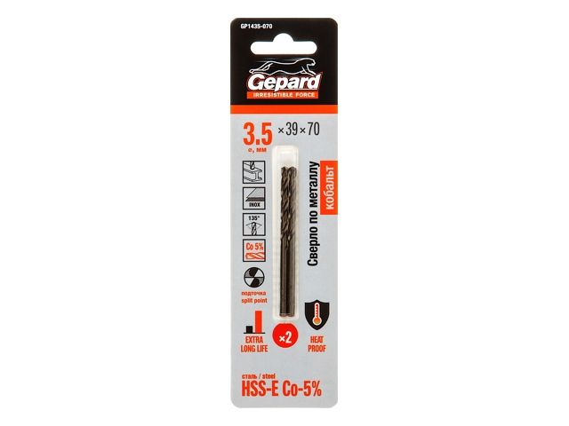 Главная » Оснастка к электроинструменту » Сверление » Сверла по металлу цилиндрический и шестигранный хвостовик GEPARD » Сверло по металлу ц/х 3.5х39х70 мм HSS-Co, комплект из 2-х шт GEPARD (кобальт 5%)