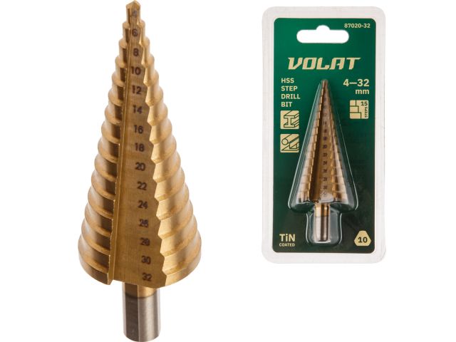 Главная » Оснастка к электроинструменту » Сверление » Сверла по металлу цилиндрический и шестигранный хвостовик ВОЛАТ » Сверло по металлу ступенчатое 4-32 мм HSS TIN ВОЛАТ (прямой профиль)