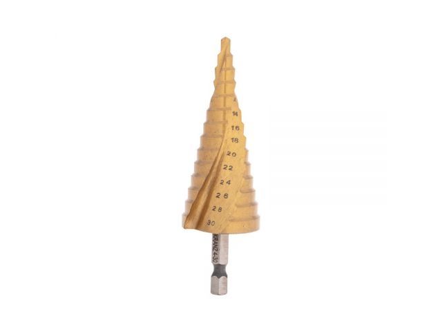 Главная » Оснастка к электроинструменту » Сверление » Сверла по металлу » Сверло по металлу ступенчатое ТИТАН 4,0-30,0 мм 98 мм 65 HRC Р6М5 TiN KRANZ (REXANT)