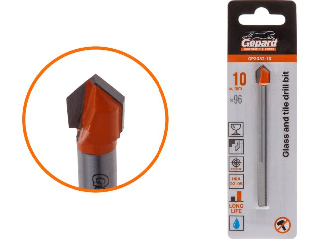Главная » Оснастка к электроинструменту » Сверление » Сверла по стеклу и кафелю » Сверло по кафелю/стеклу 10x96 мм трехгр. хвостовик GEPARD (GP2082-10) (по керамической плитке)