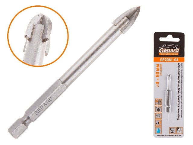 Главная » Оснастка к электроинструменту » Сверление » Сверла по стеклу и кафелю » Сверло по кафелю/стеклу 4х60мм четырехкромочное шестигр. GEPARD (GP2081-04) (Impact, по керамической плитке, крестовая пластина)