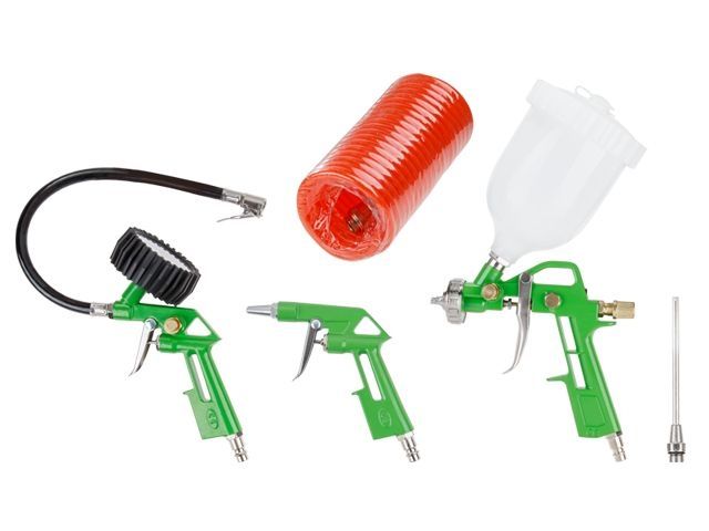 Базовый набор пневмоинструментов, состоящий из популярных компонентов, которые пригодятся начинающему пользователю воздушного компрессора. В набор входит краскораспылитель типа HVLP, пистолет для подкачки шин с манометром, продувочный пистолет для очистки поверхностей от пыли и сухой грязи, удлинительная насадка и спиральный пневматический шланг для подключения аксессуаров к компрессору.