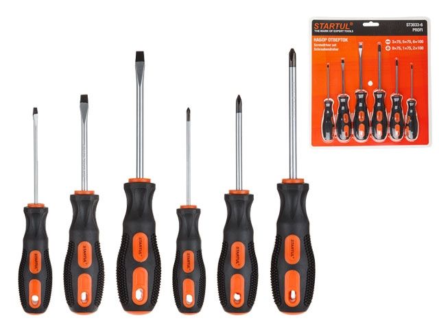 Главная » Ручной инструмент » Слесарно-столярный инструмент » Наборы отверток » Набор отверток 6шт (SL3х75,5х75,6х100 PH0х75,1х75,2х100) STARTUL PROFI (ST3033-6) (рукоятка Anti slip)