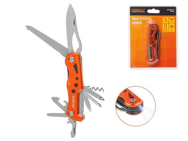 Главная » Ручной инструмент » Слесарно-столярный инструмент » Плоскогубцы, пассатижи » Нож многофункц.12 функций STARTUL PROFI (ST9501-12) (светодиодный фонарик)