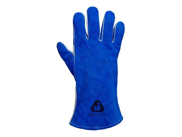 Перчатки сварщика Jeta Safety с крагой из спилковой кожи, утепленные искусственным мехом, с дополнительной накладкой на ладони, цвет синий/серый. Материал: спилок.