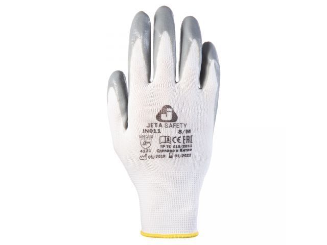 Защитные промышленные трикотажные перчатки из синтетической пряжи (полиэстер) с нитриловым покрытием ладони, цвет серый EN388: 4131X Защитные свойства: Ми, Мп Бесшовный трикотаж из полиэфирных волокон. Эластичная манжета для надёжного удержания на запястье. Тонкие и эластичные волокна. 13 класс вязки. Легкий и эргономичный дизайн. Высокая чувствительность. Высокий уровень комфорта благодаря эластичности материала. Тыльная сторона ладони без покрытия - позволяет коже дышать. Нитриловое покрытие на ладони и пальцах устойчиво к работе с жирными и масляными деталями. Хорошая стойкость к износу. Цвет: белый/серый.