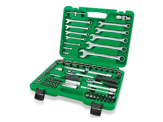 Набор TOPTUL 82 единицы уникален тем, что имеет в своей комплектации комбинированные ключи от 8 до 22 мм. Благодаря этому в относительно небольшом чемодане собран весь необходимый универсальный инструмент для любого вида ремонта автомобиля или другого вида техники. Данный набор содержит:
