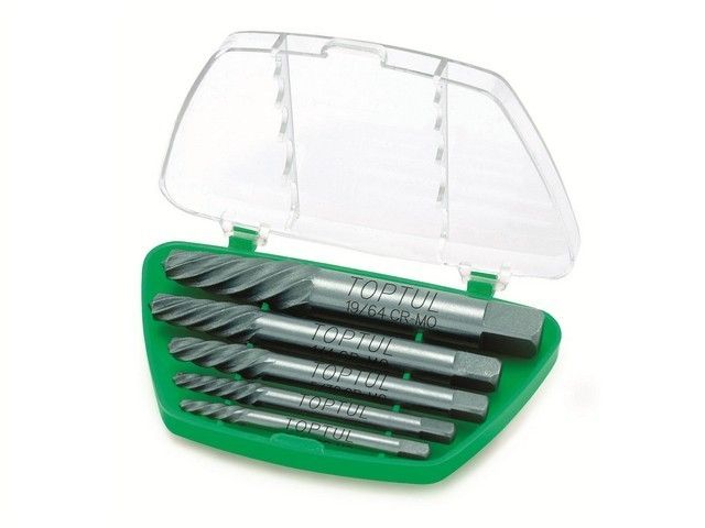 Набор экстракторов TOPTUL состоит из 5 инструментов диаметром 7/64", 9/64", 5/32", 1/4" и 19/64". Экстракторы предназначены для извлечения болтов с поврежденной или отсутствующей головкой.