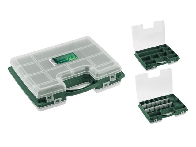 Пластиковый двухсторонний ящик выполнен в форме кейса, переставные перегородки, на одной стороне 22 отделения, на другой - 10 отделений. Служит для хранения и переноски крепежных и других мелких изделий. В нем удобно размещаются необходимые аксессуары и различные мелочи. Прозрачная крышка позволяет видеть расположение крепежа внутри.