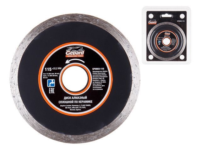 Главная » Оснастка к электроинструменту » Алмазная резка, шлифование и сверление » Алмазные круги Ф110,115мм » Алмазный круг 115х22 мм по керамике сплошн. GEPARD (мокрая резка)