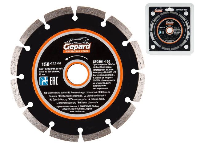 Главная » Оснастка к электроинструменту » Алмазная резка, шлифование и сверление » Алмазные круги Ф150мм » Алмазный круг 150х22 мм универс. сегмент. GEPARD (сухая и мокрая резка)