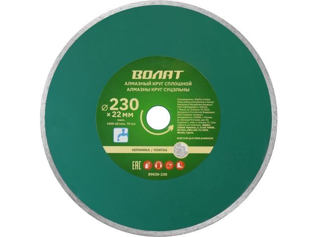 Главная » Оснастка к электроинструменту » Алмазная резка, шлифование и сверление » Алмазные круги Ф 230 мм » Алмазный круг 230х22 мм по керамике сплошн. ВОЛАТ (мокрая резка)