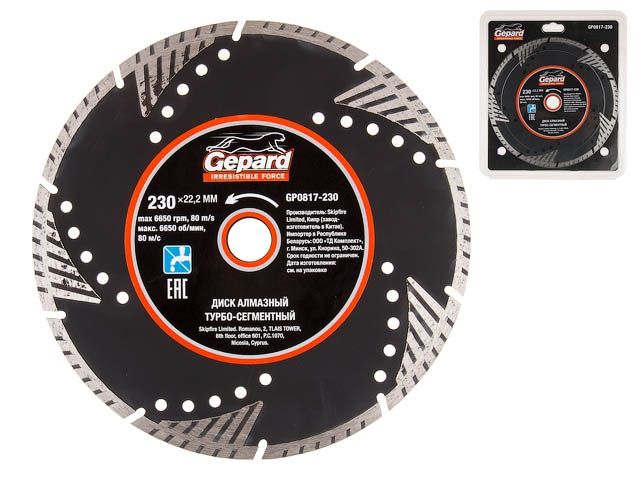 Главная » Оснастка к электроинструменту » Алмазная резка, шлифование и сверление » Алмазные круги Ф 230 мм » Алмазный круг 230х22 мм турбо-сегментный GEPARD (сухая резка, TURBO-сегментный)