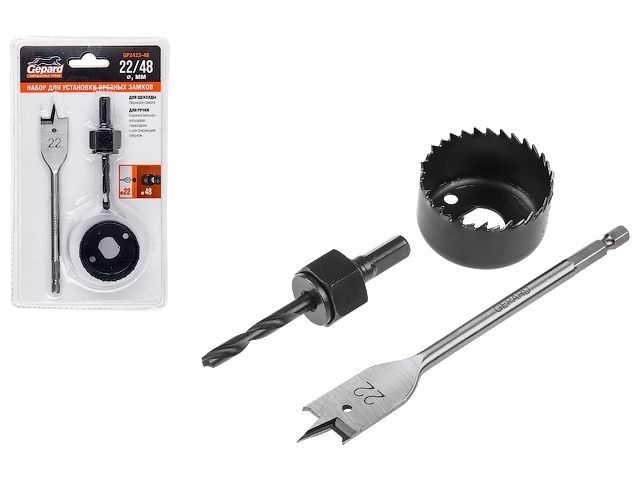 Комплект: сверло перьевое с диаметром 22мм (для щеколды) - 1шт., коронка пильная кольцевая по дереву с диаметром 48мм (для ручки) - 1шт., переходник с центрирующим сверлом - 1шт.;