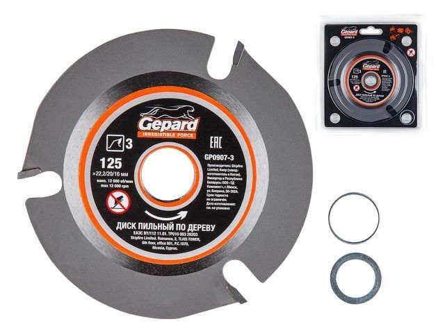 Главная » Оснастка к электроинструменту » Оснастка для угловых шлифмашин » Диск пильный 125х22.2/20/16 мм 3 зуб. по дереву GEPARD (для УШМ, твердоспл. зуб)