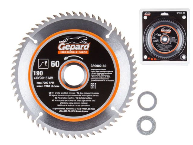 Главная » Оснастка к электроинструменту » Пилы и пилки » Пильные диски для циркулярных пил ф170-190мм » Диск пильный 190х30/20/16 мм 60 зуб. по дереву GEPARD (твердоспл. зуб)