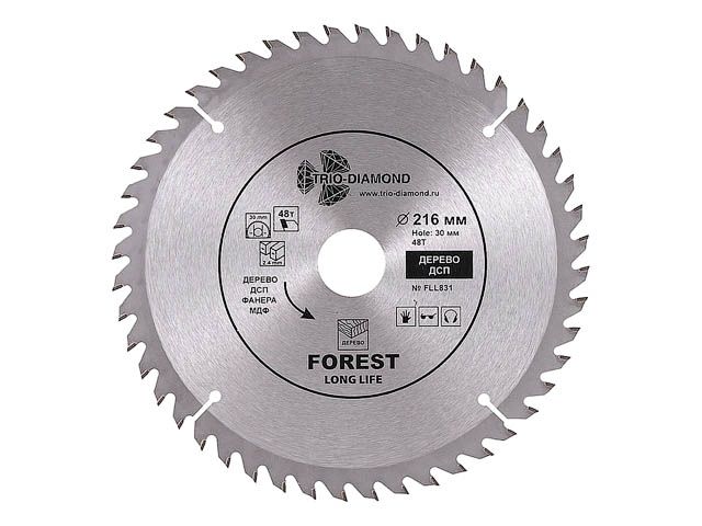 Диск пильный 216х30 мм 48 зубьев TRIO-DIAMOND Forest Long Life (FLL831) предназначен для распила древесины, ДСП, фанеры. Угол заточки 15 градусов. Максимальное число оборотов 7000 RPM. Тип диск пильный Диаметр 216 мм Количество зубьев 48 шт Ширина пропила (зуба) 2,4 мм Форма зуба ATB Максимальное число оборотов 7000 об/мин Угол наклона зубьев положительный Передний угол 15 ° Совместимость пила циркулярная, пила дисковая, пила торцовочная