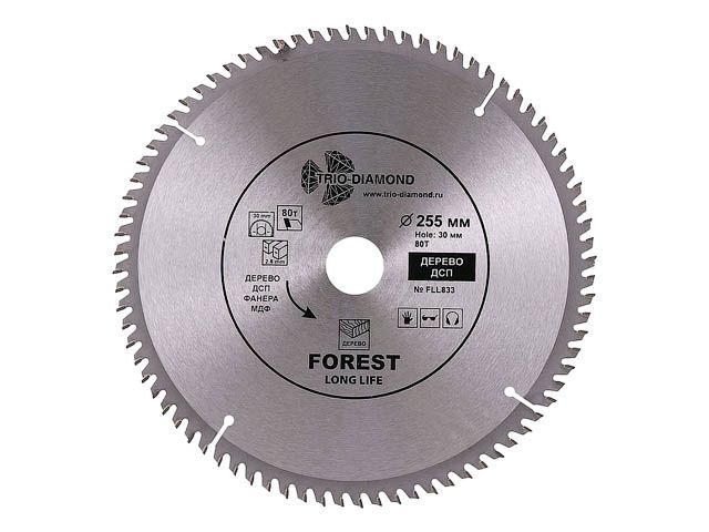 Диск пильный 255х30 мм 80 зубьев TRIO-DIAMOND Forest Long Life (FLL833) предназначен для распила древесины, ДСП, фанеры. Угол заточки 15 градусов. Максимальное число оборотов 5800 RPM. Тип диск пильный Диаметр 255 мм Количество зубьев 80 шт Ширина пропила (зуба) 2,8 мм Форма зуба ATB Максимальное число оборотов 5800 об/мин Угол наклона зубьев положительный Передний угол 15 ° Совместимость пила циркулярная, пила дисковая, пила торцовочная