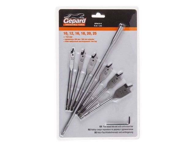 Главная » Оснастка к электроинструменту » Сверление » Сверла по дереву » Набор сверл перьевых по дереву с удлинителем 8пр. GEPARD (GP0415-8) (Impact, перовое)