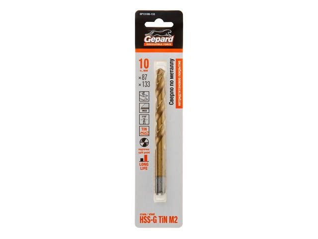 Главная » Оснастка к электроинструменту » Сверление » Сверла по металлу цилиндрический и шестигранный хвостовик GEPARD » Сверло по металлу ц/х 10.0х87х133 мм HSS TIN GEPARD (нитридтитановое покрытие)