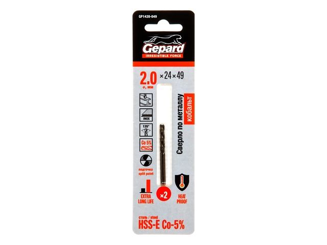 Главная » Оснастка к электроинструменту » Сверление » Сверла по металлу цилиндрический и шестигранный хвостовик GEPARD » Сверло по металлу ц/х 2.0х24х49 мм HSS-Co, комплект из 2-х шт GEPARD (кобальт 5%)
