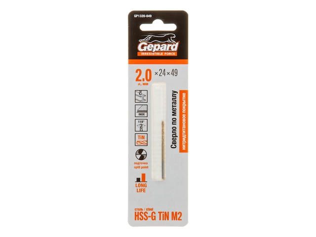 Главная » Оснастка к электроинструменту » Сверление » Сверла по металлу цилиндрический и шестигранный хвостовик GEPARD » Сверло по металлу ц/х 2.0х24х49 мм HSS TIN GEPARD (нитридтитановое покрытие)