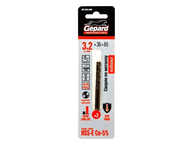 Главная » Оснастка к электроинструменту » Сверление » Сверла по металлу цилиндрический и шестигранный хвостовик GEPARD » Сверло по металлу ц/х 3.2х36х65 мм HSS-Co, комплект из 2-х шт GEPARD (кобальт 5%)