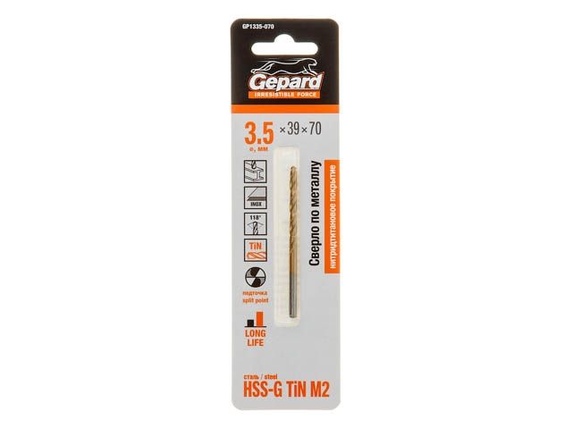Главная » Оснастка к электроинструменту » Сверление » Сверла по металлу цилиндрический и шестигранный хвостовик GEPARD » Сверло по металлу ц/х 3.5х39х70 мм HSS TIN GEPARD (нитридтитановое покрытие)