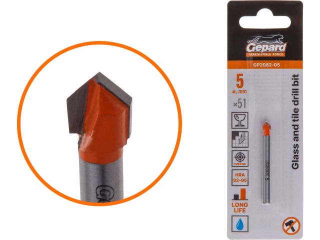 Главная » Оснастка к электроинструменту » Сверление » Сверла по стеклу и кафелю » Сверло по кафелю/стеклу 5x51 мм ц/х GEPARD (GP2082-05) (по керамической плитке)