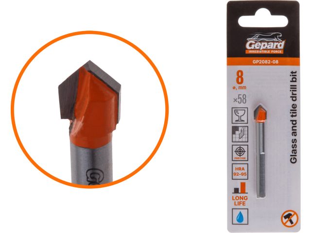 Главная » Оснастка к электроинструменту » Сверление » Сверла по стеклу и кафелю » Сверло по кафелю/стеклу 8x58 мм трехгр. хвостовик GEPARD (GP2082-08) (по керамической плитке)
