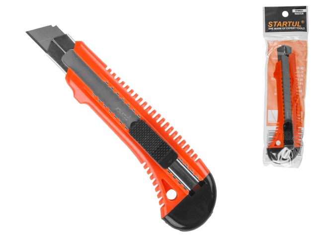 Тип корпуса: пластмассовый корпус, металлическая направляющая, кнопки выдвижения и механизм автоматической фиксации сменного лезвия;